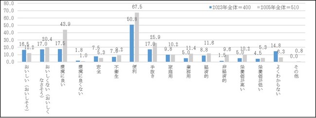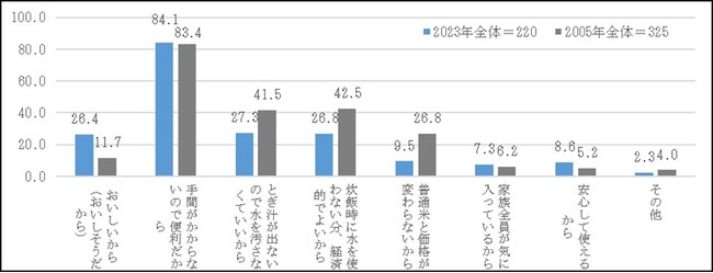 また、今後の購入意向者からは、「手間がかからないので便利だから」が84.1%と最も高く、2005年調査と同様の傾向が見られる。「おいしいから(おいしそうだから)」は26.4%と、2005年調査と比べ14.7ポイント上昇しており、食味を理由に購入したい人が増えている。一方で、「とぎ汁が出ないので水を汚さなくていいから」27.3%、「炊飯時に水を使わない分、経済的でよいから」26.8%、「普通米と価格が変わらないから」9.5%は2005年調査より低下している。