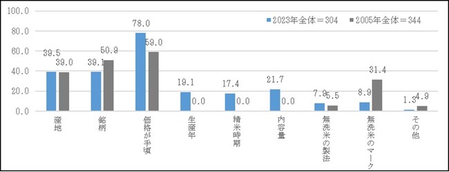 ※2005年調査では「価格が手頃」は「価格」、「無洗米の製法」は「製法」と聴取。「生産年」「精米時期」「内容量」は聴取していない。