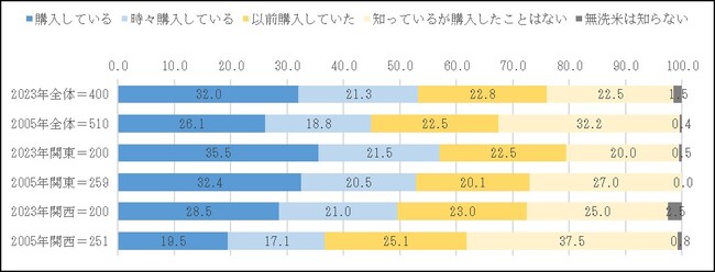 無洗米を「購入している」32.0%、「時々購入している」21.3%で、合計すると無洗米購入者が53.3%となった。2005年調査と比べ、購入者が8.4ポイント増加し、購入率は半数を超えた。また、「知っているが購入したことはない」は32.2%から22.5%に減少し、過去を含めた購入経験者は7割を超える。
