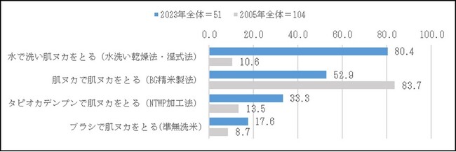 製造方法を知っている人に具体的に知っている製造方法を複数回答で聞いたところ、「水で洗い肌ヌカをとる」が最も高く80.4%であり、「肌ヌカで肌ヌカをとる」が52.9%で続く。2005年調査では「肌ヌカで肌ヌカをとる」製造方法が最も高く、認知されている製造方法が2005年と比べ大きく異なる結果となった。