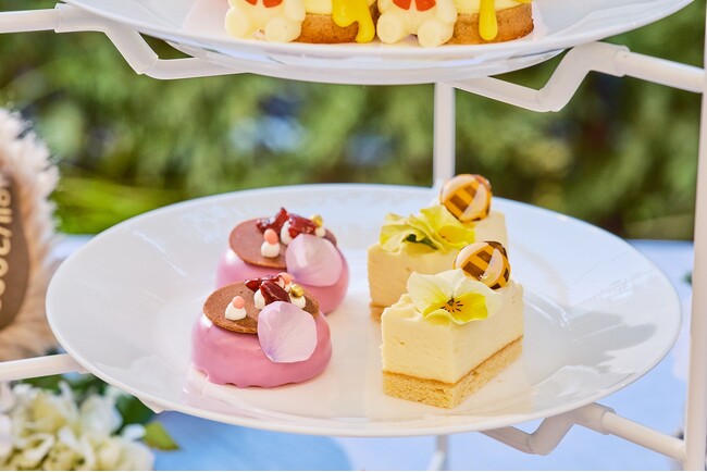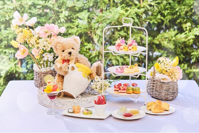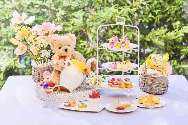 優しいピンク、イエロー、ラベンダー、ミントグリーンの柔らかな色合いで春の花々が美しく咲き誇る様子を表現したパティシエ特製のスイーツは、みずみずしい旬のいちごに美しい蝶がとまった「いちごとシャンパンジュレのヴェリーヌ」、アイコニックなテディベアがキュートな「はちみつフィナンシェのオレンジクリームサンド」、ラベンダーカラーが美しい「グリオットチェリーのムース」、「ピスタチオ&フランボワーズのエクレア」など6種類が三段スタンドで登場。さらに別皿で提供される3種の軽食、スタッフがお席までお届けする焼き立てスコーン2種と選べるコンディメント3種を、フランスの老舗紅茶ブランド「マリアージュ フレール」より選び抜かれた紅茶やフレーバードティーとともにお楽しみいただけます。