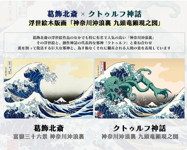 本作では北斎の荒々しい自然の驚異をH.P.ラヴクラフトが生み出した代表的な邪神「クトゥルフ」と重ね合わせ、波を割って復活する巨大な邪神と、為す術なくそれに翻弄される人間の姿を表現しました。葛飾北斎とH.P.ラヴクラフト、そして日本の伝統技法である浮世絵の3つアートを融合したことで生まれる迫力と神秘性をぜひお手に取ってお楽しみください。