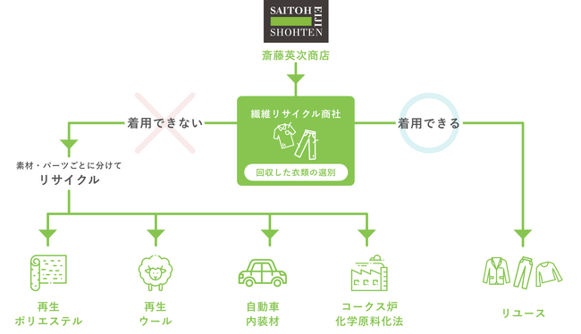 洋服としてリユースされるだけではなく、素材やパーツごとに分けてリサイクルされ、自動車内装材や再生ポリエステルなどになります。