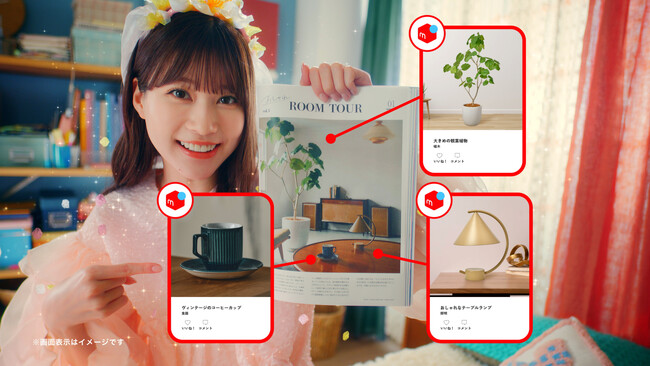 1人暮らしで雑誌を眺める女性。おしゃれな部屋に憧れる女性の隣りに「春の精」の生見愛瑠さんが登場します。雑誌の中の商品が「メルカリ」で買えることを熱弁し、最後は「春の精」らしく「買っちゃいなよ~!春だし」と女性を後押しします。