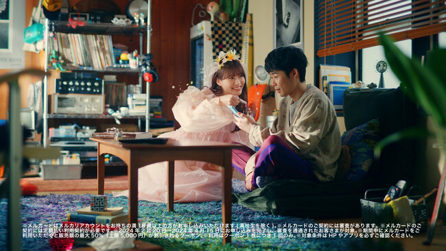 1人暮らしでスマホを眺める男性。カメラが欲しいけど迷っている男性の目の前に「春の精」生見愛瑠さんが登場します。驚く男性をよそに、「メルカードに入会したら半額で買えちゃうよ」と生見愛瑠さんがお勧めし、「スマホ開いて!急いで!」と男性を急かします。