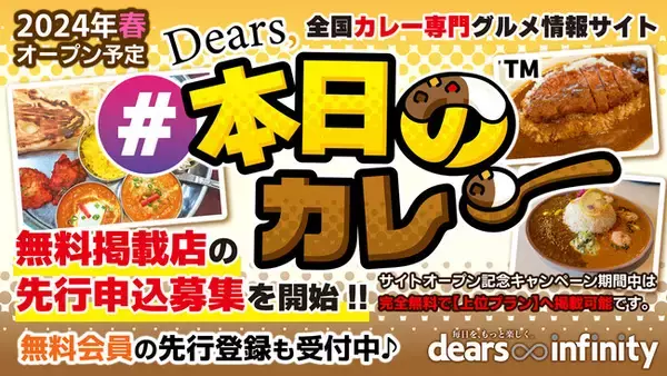 ウェブ広告や飲食店向け集客支援サービスを手掛ける 株式会社dears infinity(ディアズ・インフィニティ)にて、2024年春オープン予定の全国カレー専門グルメ情報サイト「Dears, #本日のカレー」無料掲載店の先行申込募集を開始いたしました。カレー関連メニューを提供している国内すべての店舗が申込可能です。