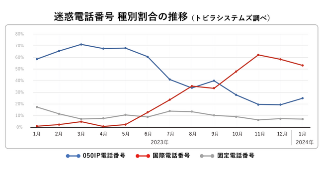 国際電話番号を利用した特殊詐欺が多発しています。トビラシステムズの調査で、2024年1月に新たに確認された迷惑電話番号の種別割合は国際電話番号の割合が53.2%で、2023年11月から引き続き高水準で推移しています。