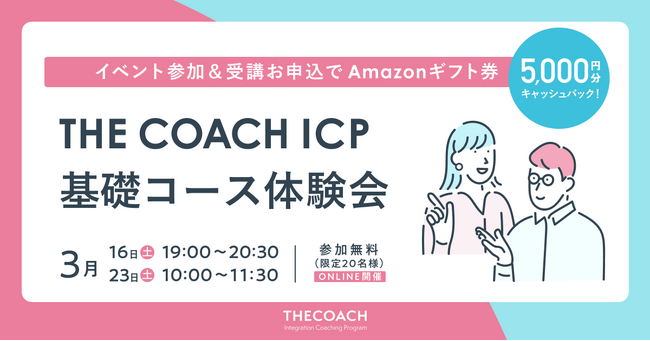 期間内に、定期開催している無料体験会もしくは、2024年3月16日(土),3月23日(土)いずれかの「THE COACH ICP基礎コース体験会」へ参加後、7日以内に、複数コースをまとめてお申し込みされた方を対象に、Amazonギフト券1万円分をプレゼントさせていただきます。