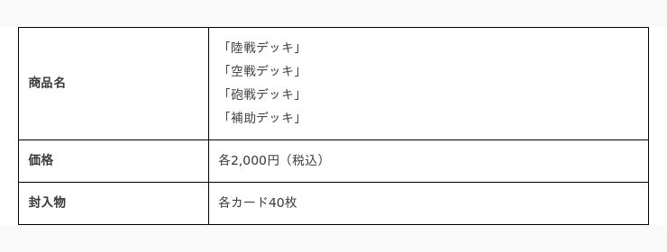それぞれ「陸戦デッキ&空戦デッキセット」や「砲戦デッキ&補助デッキセット」に封入されている2つのデッキを分割した、個別のデッキとなっています。