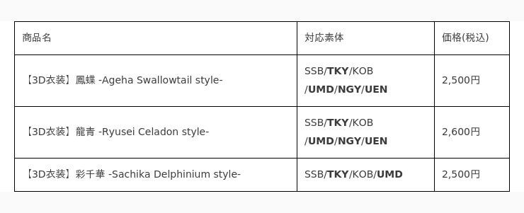 大丸・松坂屋3Dアバター衣装販売開始日と対応素体