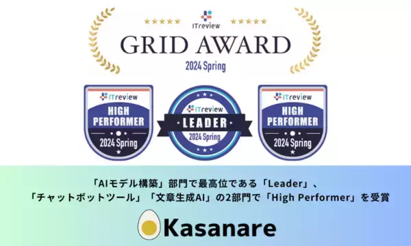 Generative AIの社会実装を加速するカサナレ株式会社(本社:東京都渋谷区、代表取締役:安田喬一)は、IT製品レビュープラットフォーム「ITreview」で発表された「ITreview Grid Award 2024 Spring」において、ユーザーから認知度・満足度共に優れた製品であると評価され、「AIモデル構築」部門で最高位である「Leader」、「チャットボットツール」「文章生成AI」の2部門で「High Performer」を受賞したことをお知らせします。