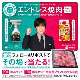 本キャンペーンは、自宅で焼肉を楽しんだ際に、布に染みこみ空間に漂う調理臭を消臭できる新商品を実際に体感いただくべく、創味食品とコラボした「おうち焼肉セット」が当たるキャンペーンです。
