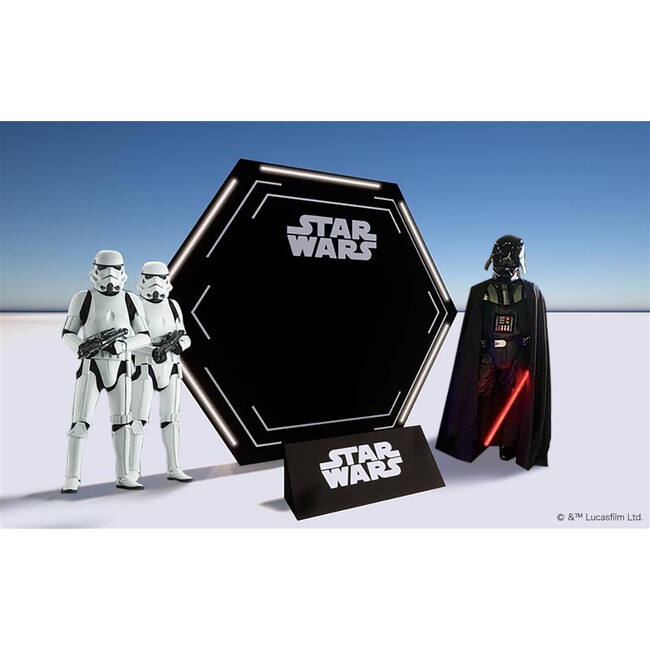 「スター・ウォーズの日」を記念したフォトスポットを背景に、記念撮影をお楽しみください。当日は会場で、コスチューム・キャラクターに会えるかも!