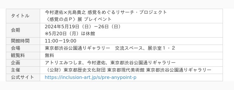 東京都渋谷公園通りギャラリーでは、展覧会「今村遼佑×光島貴之 感覚をめぐるリサーチ・プロジェクト〈感覚の点P〉」(会期:2025年2月~5月予定)の開催に先立ち、プレイベントを実施します。