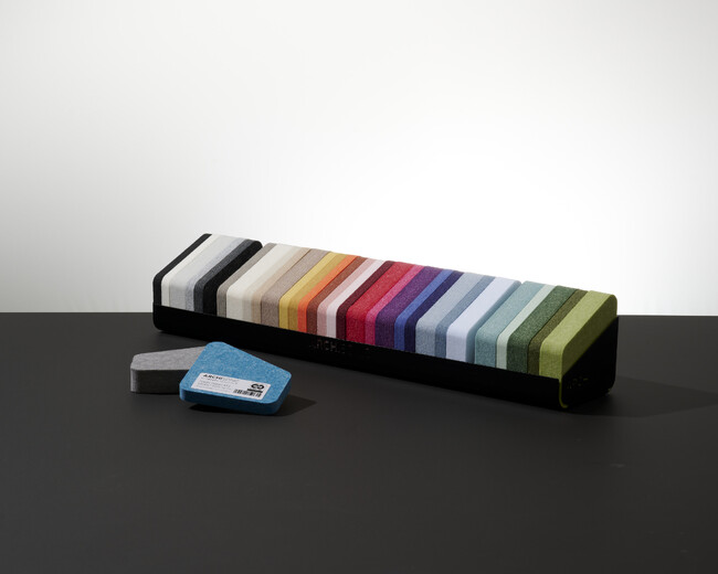100%再生PET素材から作られたテキスタイルです。テキスタイルならではの自由度があり、様々なデザインスキームにお使いいただけます。「アーキソニック(R)︎フェルト」同様に32色のカラーバリエーションをご用意しています。