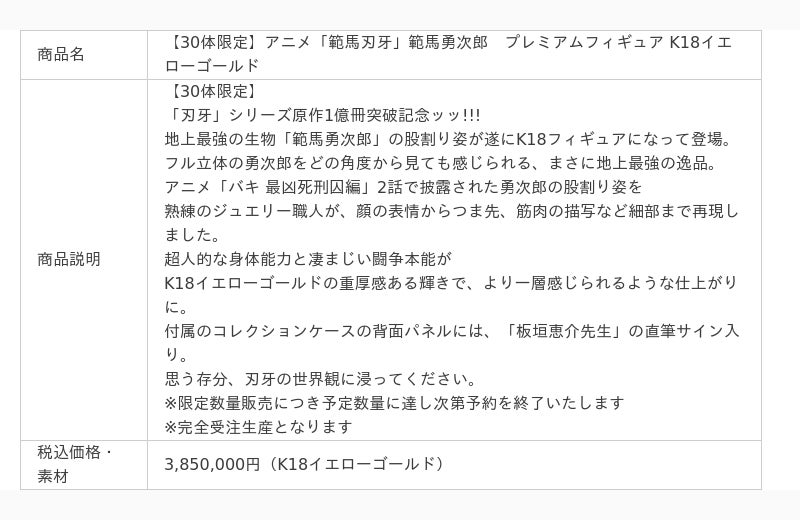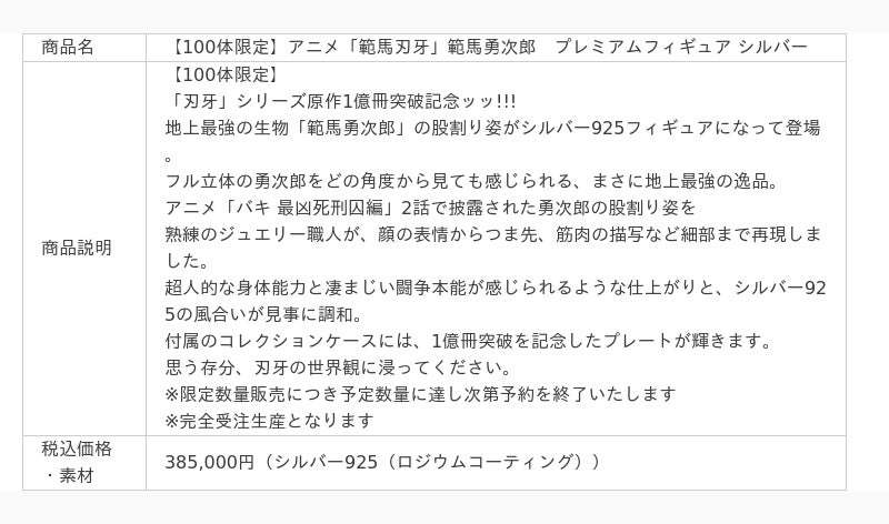 株式会社ユートレジャー(本社:東京都新宿区、代表取締役:伊藤 崇史)は、「刃牙」シリーズ原作1億冊突破を記念してアニメ「範馬刃牙」範馬勇次郎プレミアムフィギュアを2024年5月21日(火)~8月15日(木)の期間限定で予約受付を行います。K18イエローゴールドは30体、シルバー925は100体の数量限定です。