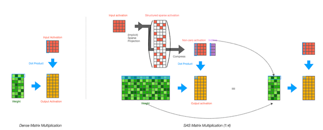 本研究で提案するSAS(Structured Activation Sparsification)は、入力の一部をゼロにするのではなくむしろ、「連続するM個のうち1個だけ値を持つ」ような規則で入力の次元を増やす変換をします。これにより、入力数はM倍の構造化されたスパースな行列となり、重み行列もM倍のパラメータを有することが可能となります。この演算は率直には元の行列に比べてM倍の演算量を必要としますが、その構造を持ったスパース性を利用することで、元の行列と同じ大きさの小さな行列同士の演算に帰着できます。さらに、M=2の時はNVIDIA社のAmpere(Sparse Tensor Core)やAMD社のCDNAなどに搭載のスパース行列の高速計算機能を入力行列に応用することでそのまま実装することが可能です。