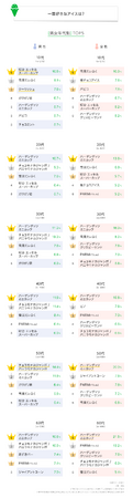次に男女年代別にみていくと、全体1位の「ハーゲンダッツ ミニカップ」は男性よりも女性の割合が高く、10代の男女と50代男性を除き、すべての年代でも1位になっています。また、年代が上がるほど割合が高くなる傾向がみられ、50~60代の女性では2割超と高めでした。