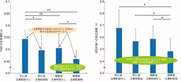 図: 経験と注意意識の制御が、運転環境認知における視覚的注意を反映するP300に与える影響(左)、認知対象への反応速度(右)。