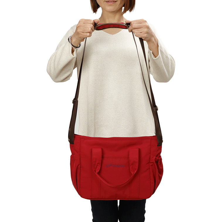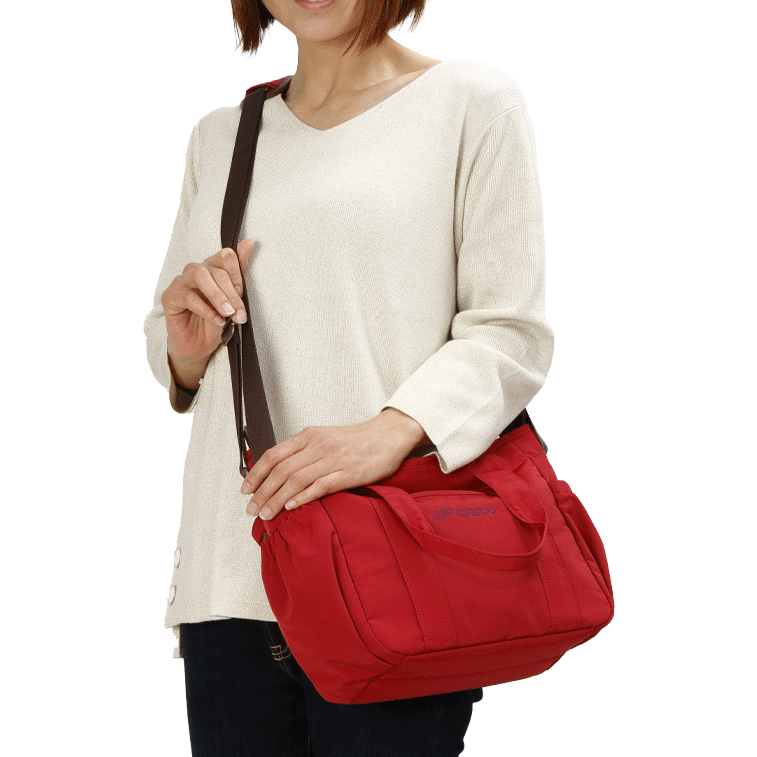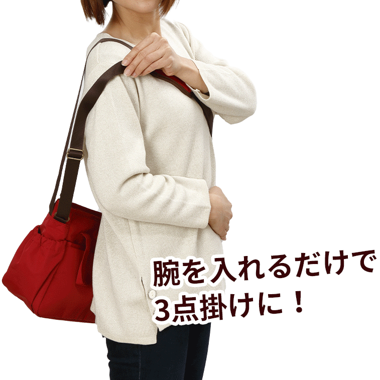 日本の「たすき」や「おんぶ紐」からヒントを得て、これらの問題を、ぜーんぶ解決できる画期的なアイデア! なんと、5通りの掛け方を、1つのベルトで、しかも、付替えの必要もなく実現してくれる「コアルーバッグ」です。