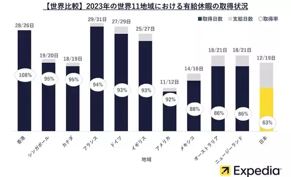 エクスペディアが実施した「有給休暇の国際比較調査」によると、2023年の日本で働く人の有給休暇の支給日数が平均19日間、そのうち平均で12日間の有給休暇を取得しており、取得率は63%でした。この取得率は世界11地域のなかで最も低く、最下位となりました。