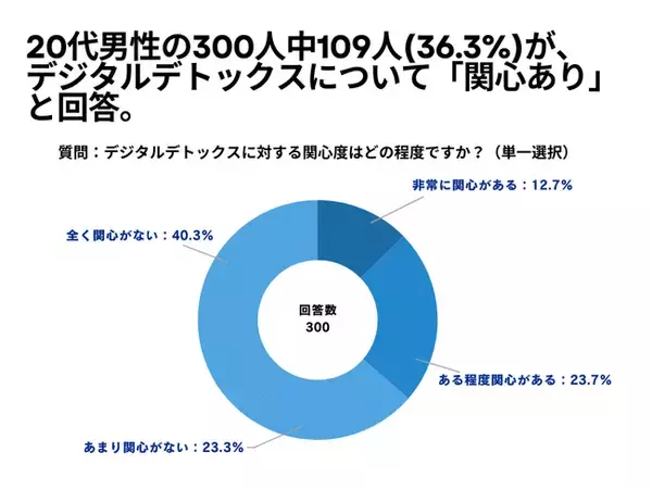 20代男性の300人を対象とした「デジタルデトックスに対する関心度はどの程度ですか?」というアンケートで109人(36.3%)が「デジタルデトックスについて関心あり」という結果になりました。