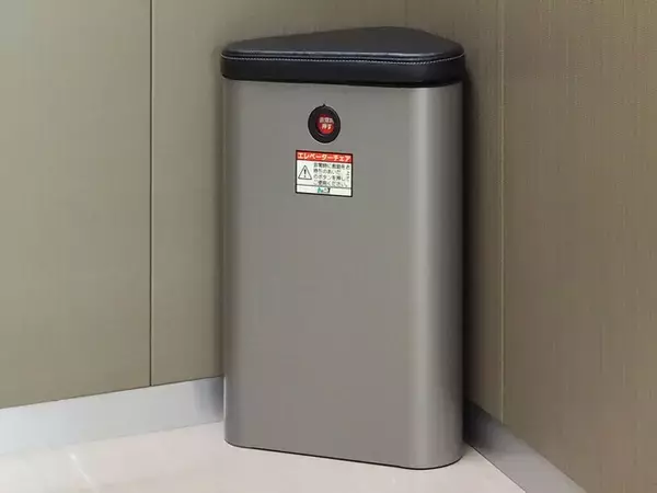 災害等で閉じ込めが発生した際に、エレベーターのかご内で復旧を待つ間に活用するための保存水、簡易トイレ等の非常用品を収納した三角柱型の椅子型ボックスです。トイレシートを本体に被せて、着座してトイレとして利用することもできます。
