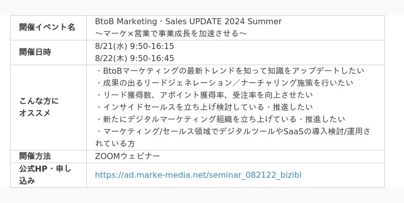 株式会社Bizibl Technologies(本社:東京都千代田区、代表取締役:花谷燿平、以下当社)は、株式会社マーケメディアが2024年8月21日(水)【DAY1】、8月22日(木)【DAY2】に開催する「BtoB Marketing・Sales UPDATE 2024 Summer~マーケ×営業で事業成長を加速させる~」に登壇することをお知らせいたします。