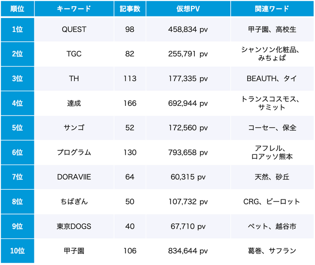 1位と10位は「SDGs QUEST みらい甲子園」のニュース。8月8日に開催の、全国から選ばれた高校生たちが未来の教育について話し合うイベントです。企画・協賛企業によるプレスリリースのほか、教育とITの専門ニュースサイト、参加した高校の地元の新聞・テレビ局が記事にしていて、転載を含めて多くのPVがあります。