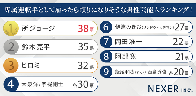 株式会社NEXERは、役員運転手派遣・社長秘書派遣の「株式会社トランスアクト」と共同で「専属運転手として雇ったら頼りになりそうな男性芸能人」に関するアンケートを実施したので、その結果を紹介します。
