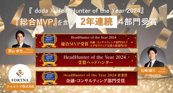 ハイクラス転職エージェントのフォルトナ株式会社(代表取締役:三石 真司、本社:東京都千代田区)は、パーソルキャリア株式会社が運営をするハイクラス転職サービス「doda X」主催「HeadHunter of the Year by doda X 2024」にて、総合MVPを含む4部門で表彰されました。