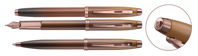100 シリーズは落ち着いたダークコーヒーブラウンのグラデーションで、天冠にはエレガントなカップとハートの立体的なデザインが施されています。トリムとペン先は豪華なブラウンPVD仕上げ。