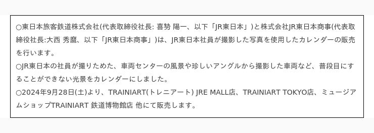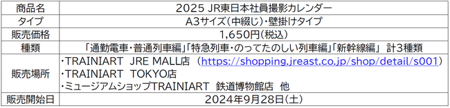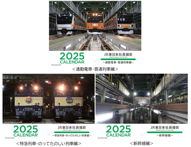 JR東日本の乗務員区や車両センターに所属する社員が、日頃接する光景を撮りためたものを厳選しカレンダーにまとめました。2025年は、「通勤電車・普通列車編」「特急列車・のってたのしい列車編」「新幹線編」の3つにテーマを絞り、3種類のカレンダーを制作しました。通勤電車の通常営業運転ではみられない姿や、のってたのしい列車、増備中の山形新幹線E8系等、JR東日本社員の目線で撮影された貴重な場面を、ぜひともカレンダーでお楽しみください!