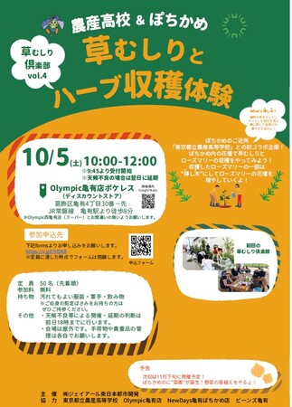 今回はその第4弾をとして「草むしり俱楽部vol.4 草むしりとハーブ収穫体験」を開催します。初めての試みとして、ぽちかめのご近所さんでもあります「東京都立農産高校」とコラボレーションし、より楽しく学びながら植物に触れ合う機会をつくります。当日はぽちかめ内の花壇で草むしりとローズマリーの収穫を行います。詳細は別紙をご確認のうえ、気軽にお申込みください。
