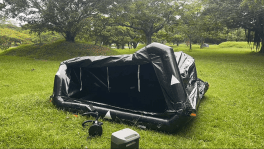MANTAエアーフレームテントは、空気を入れるだけで設営が完了する画期的なシステムを採用しています。通常の骨組みを組み立てる手間を完全に排除し、電動空気入れを使用すれば誰でも1分以内に設営が完了します。また、撤去も3分で簡単にできるため、忙しいアウトドアの時間を有効に活用できます。