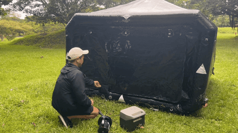 PVC素材であることと、黒い素材であることで、「テント内の温度を高温化してしまうのではないか」という心配は全く必要ありません。トンネル構造の原理によって、空気の流れを効率よく取り込み、涼しい空間を作り出します。大きな窓と全開放可能な入口が風を通しやすく、自然の風を最大限に活かし、エアコンなしでも涼しさを感じられる設計です。