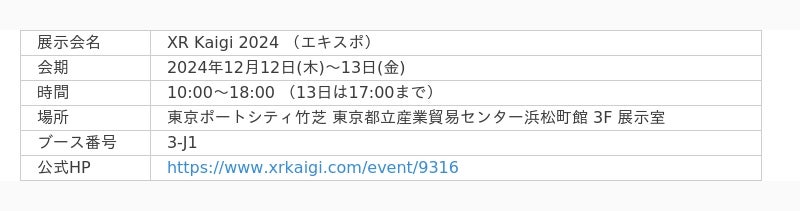 コーンズテクノロジー株式会社(本社:東京都港区、代表取締役社長 西岡和彦)は、2024年12月12日(木)~ 12月13日(金)に東京ポートシティ竹芝で開催されるXR/メタバースがテーマの国内最大級カンファレンス『XR Kaigi 2024』のエキスポエリアに出展します。