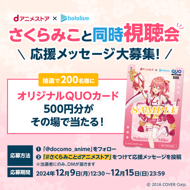 「dアニメストア」公式Xアカウントをフォローのうえ、ハッシュタグ「#さくらみことdアニメストア」を付けて応援メッセージを投稿いただいた方の中から抽選で200名さまに、オリジナルQUOカード500円分をプレゼントいたします。