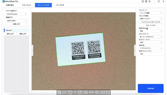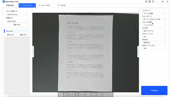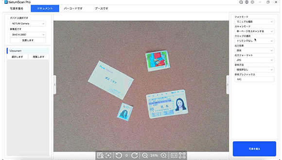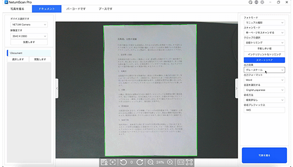 ※スキャナーの特性上、淡い色の背景や紙の色に近い背景では、コントラストが不足し、自動認識が困難になる場合がございます。そのため、背景には濃い色をご利用いただくことをお勧めいたします。ただし、自動トリミングモードでは、周囲の照明条件や過度なコントラストの影響により、過剰露出が発生する場合がございます。このような場合には、カメラの設定で露出補正値を適切に調整することで、より高品質な画像を取得できます。