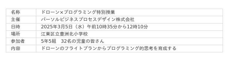 本授業の実施に伴い、ドローン・MaaS ソリューション事業を展開する当社と豊洲北小学校が連携し、「プログラム教育カリキュラム」を共同で開発。