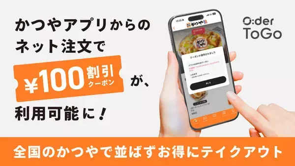 O:der ToGoのクーポン機能を活用し、かつやで高い利用率を誇る「100円割引券」が、かつやアプリからのネット注文においても全国の店舗で適用可能になりました。(※1)