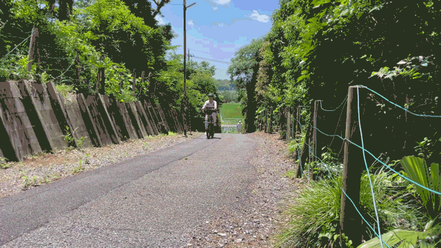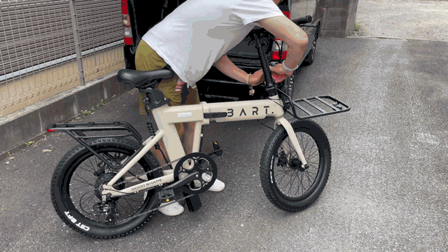 ハンドルを倒して、サドルを下げて、スタンドを畳み、フレームの中央のロックを解除して二つにたたみます。重量25kgなので一人で持ち上がります。道を選ばないBARTなら郊外でも大活躍です。
