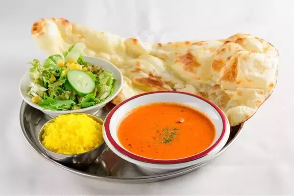 豆カレー、チキンカレー、キーマカレー、野菜カレー、マトンカレー、シーフードカレー、バターチキン、ホウレン草、海老カレー、トマト茄子、キーママトンからお選びいただけます。