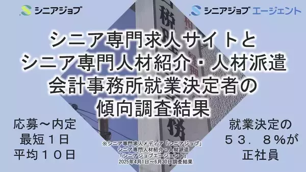 シニア転職支援の株式会社シニアジョブ(本社:東京都新宿区/代表取締役 中島康恵)は、運営するシニア専門求人サイト「シニアジョブ」と、シニア専門人材紹介・人材派遣「シニアジョブエージェント」を介して、2025年4月1日~6月30日の3カ月間に税理士や税理士補助などの会計事務所の仕事に就業決定したシニア求職者の傾向調査を行い、求人サイトの利用者では、応募から内定まで最短1日、平均10日といった調査結果を発表しました。このほか、2024年の会計の仕事の就業決定者の傾向調査結果と比較した、雇用形態割合の変化などの情報も公開しています。