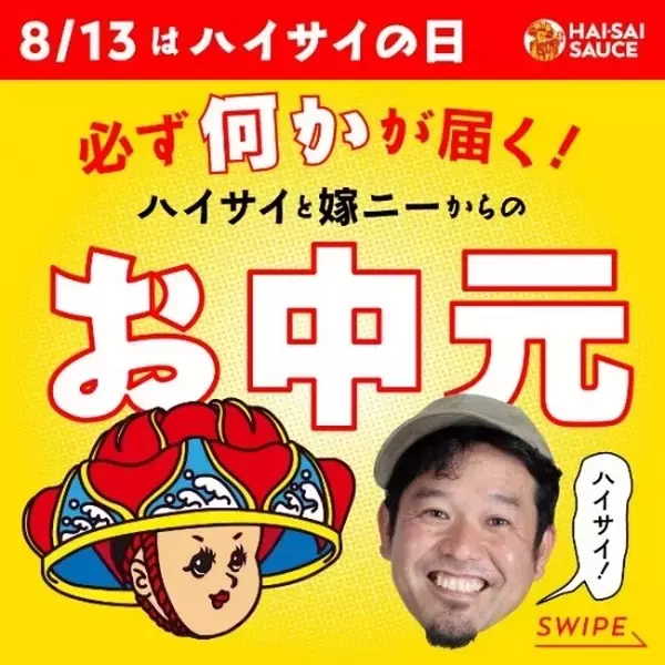 ■『必ず何かが届く!ハイサイと嫁ニーからのお中元』キャンペーン概要 キャンペーン期間中、ハイサイソース公式サイト https://www.haisai-sauce.com/ でご購入頂くと、ハイサイと 嫁ニーからのお中元をもれなく同梱してお届けいたします。
