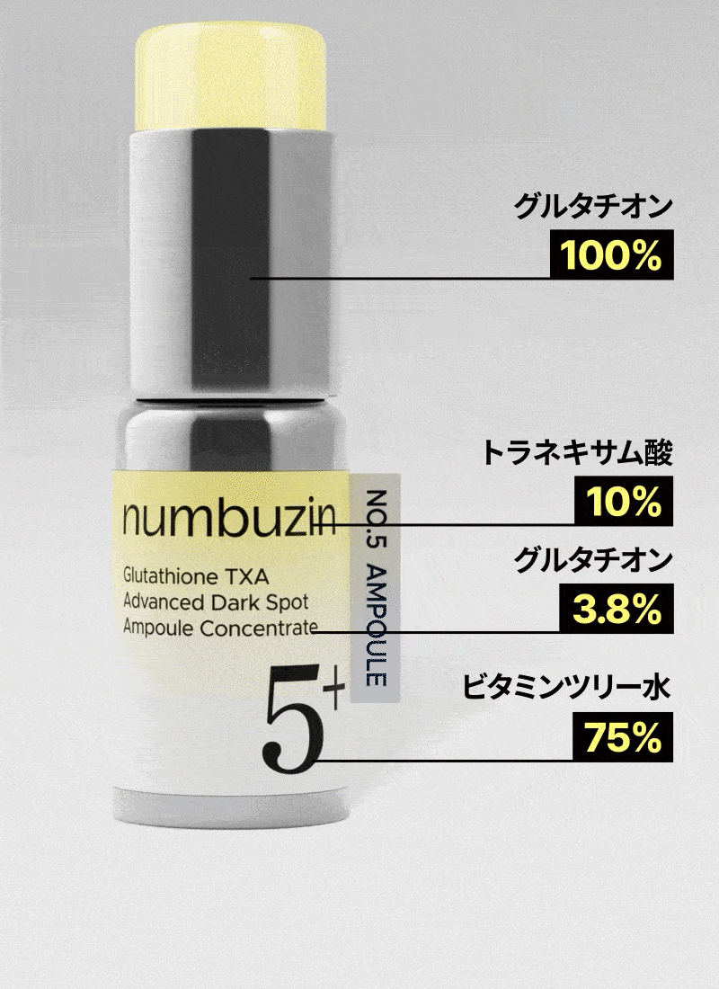 5番白玉グルタチオン*³100xTXA10集中トーニング美容液5番集中美容液には、美容医療でも注目されている成分「グルタチオン*³」と、トーンアップ効果に優れた「トラネキサム酸*⁴」を配合しています。
