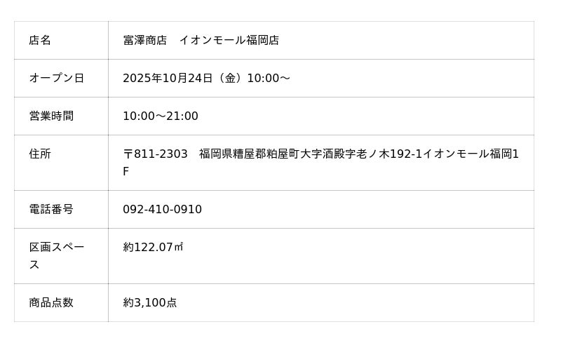 日本最大級の製菓・製パン材料、器具専門店として創業106年の株式会社富澤商店は、2025年10月24日(金)にイオンモール福岡(1F・食品売場エリア)に「富澤商店 イオンモール福岡店」をオープンいたします。福岡県内での直営店は3店舗目、また九州内で最大の品揃えを誇る大型店舗です。