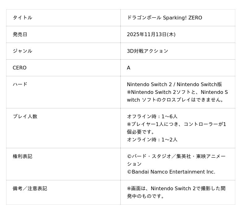 今後の情報は、Nintendo Switch 2/Nintendo Switch版「ドラゴンボール Sparking! ZERO」特設サイト、及び「ドラゴンボール」家庭用ゲーム公式Xをご確認ください。