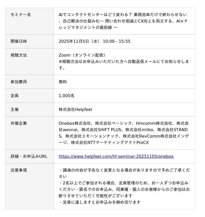 メール起点のDXツール『yaritori(ヤリトリ)』を提供するOnebox株式会社(本社:東京都渋谷区、代表取締役:奥村 恒太、以下:Onebox)は、2025年11月5日(水)に開催される株式会社Helpfeel(本社:京都府京都市、代表取締役/CEO:洛西 一周)主催のオンラインセミナー「AIでコンタクトセンターはどう変わる? 業務効率だけで終わらせない、自己解決の仕組み化」に共催企業として参加いたします。