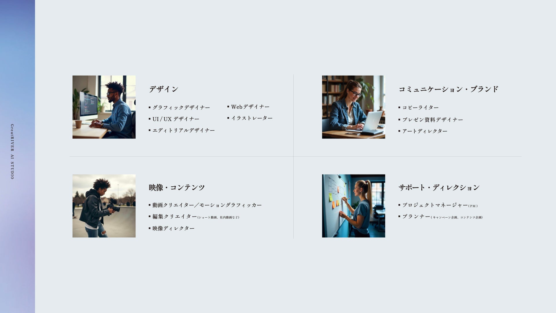生成AIを恐れず、使いこなし、創造性の裾野を広げる。「GreatRIVER AI STUDIO」は、すべての企業が“創造する力”を持つ社会の実現を目指します。